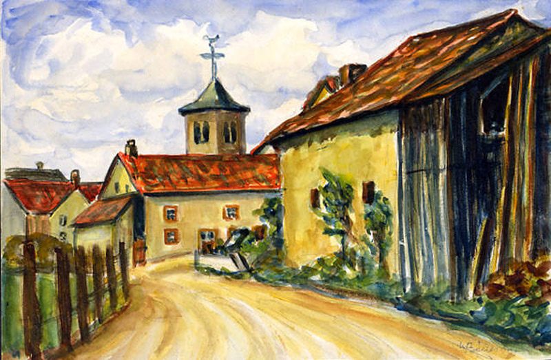 Biesdorf im vergangenen Jahrhundert Das dörfliche Aquarell stammt vom ehemaligen Schulleiter Pater W. Büllesbach.