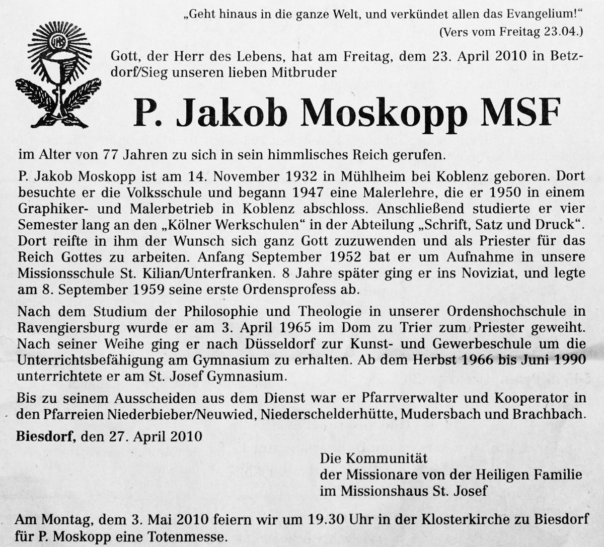 Am 23. April 2010 ist in Betzdorf Pater Dr. Jakob Moskopp verstorben, der in der Zeit von 1966 bis 1990 am Sankt-Josef-Gymnasium die Fächer Bildende Kunst, Religion und Erdkunde unterrichtete. Lesen Sie hier die Todesanzeige, die im Trierischen Volksfreund am 28. April 2010 erschienen ist.