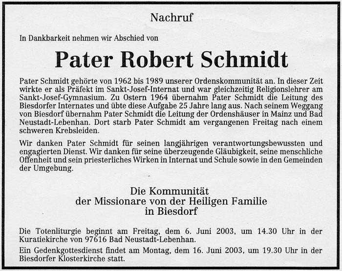 Am Freitag, dem 30. Mai 2003, erhielt die Biesdorfer Ordenskommunität während einer Besichtigung der Cusanus-Stiftung in Bernkastel-Kues die Nachricht, dass Pater Schmidt am Morgen des Tages verstorben sei.