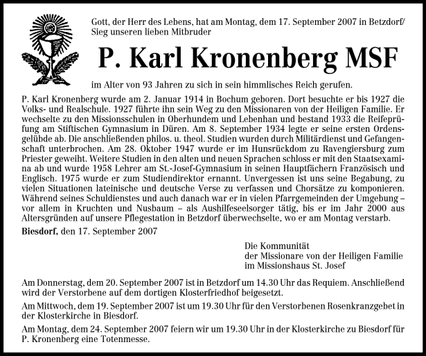Am 17. September 2007 verstarb Pater Karl Kronenberg im Alter von 93 Jahren. 80 Jahre lang verband sich sein Lebensweg mit den Missionaren von der Heiligen Familie.